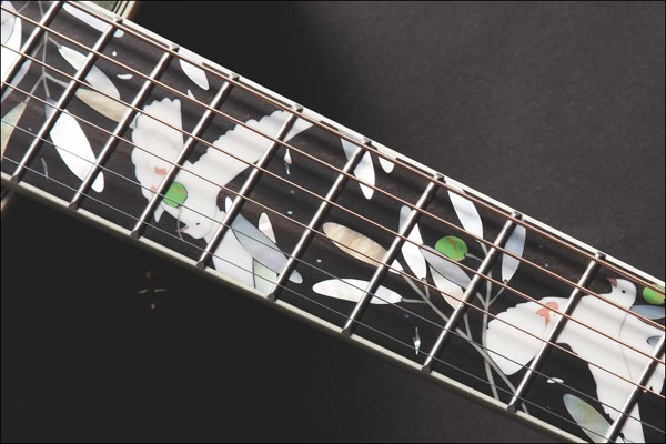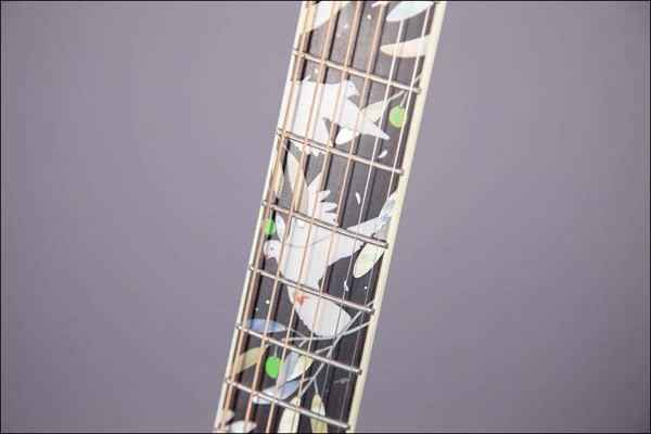 Shown below is the LTD 2020, celebrating “Peace” for today and into the future. This guitar features an intricate Dove Of Peace fretboard inlay and a Foliage Green brushed motif top made of solid spruce.