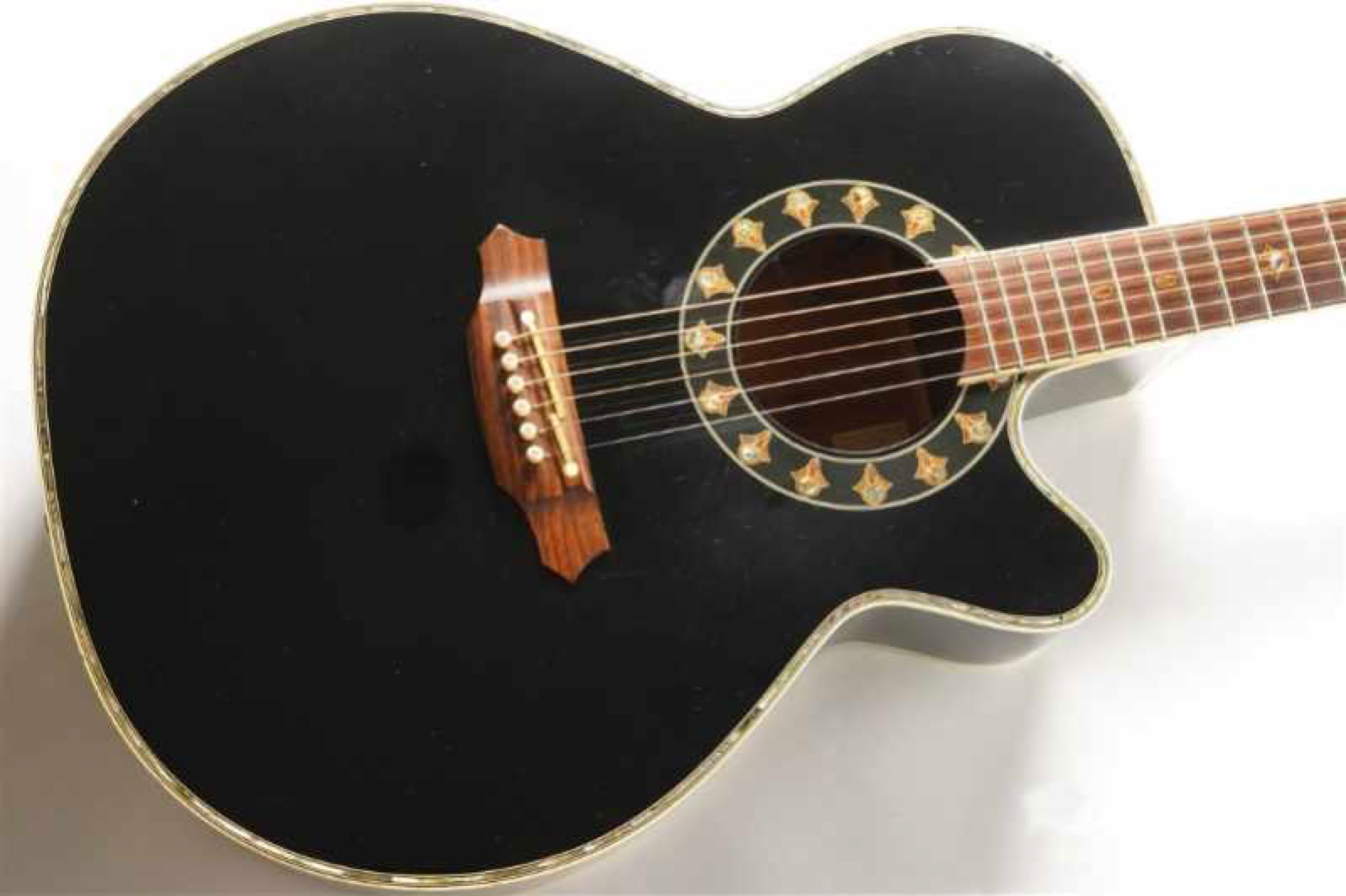 Shown below is the LTD 1996, an NEX sized guitar finished in gloss black. The top is solid Spruce and the sides/back are made from Campnosperma wood. The rosette and fretboard feature inlaid woods.