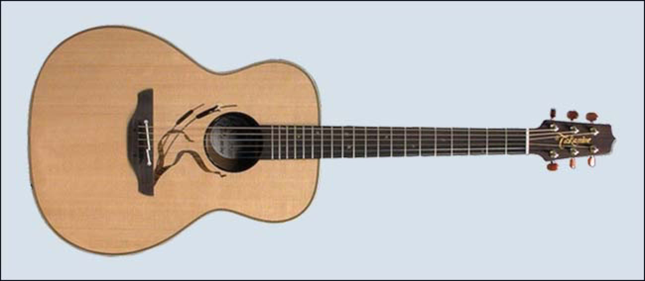 Shown below is the LTD 2005, an OM sized body of solid Spruce top and solid Sepele back and sides. Beautiful wooden Cat Tails are inlaid on the top with Floating Seeds inlaid as fret markers..
