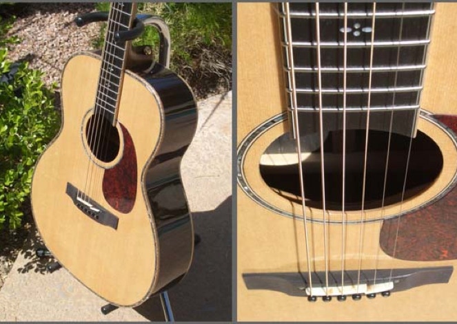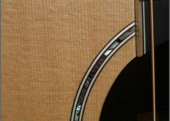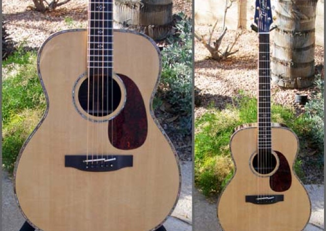 In 2005 Takamine set out to build a very special limited edition guitar. The company had been sitting on a stock of coveted Brazilian rosewood, sufficient quantity for the back and sides of about 100 guitars. Sorting the wood and discarding those that did not meet stringent standards for tonewood, the yield was about 85 sets. The decision was made to design the guitar as an OM size. Overall dimensions are very similar to OM models from other makers. The nutwidth would be a wide 1-3/4 inch to appeal to fingerpickers as well as strummers. And the guitar would have sufficient cosmetic treatment, such as inlaid abalone and maple trim, to compliment the rare Brazilian wood.
